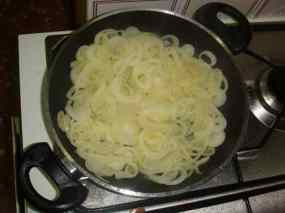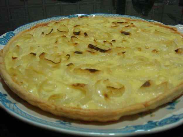 - Traieu-ho i farciu-la amb la següent preparació: talleu la ceba a rodanxes fines i ofegueu-la amb un xic d’oli i margarina, sense que es dauri. Un cop freda s’escampa per sobre la tarta i es cobreix amb la crema preparada.