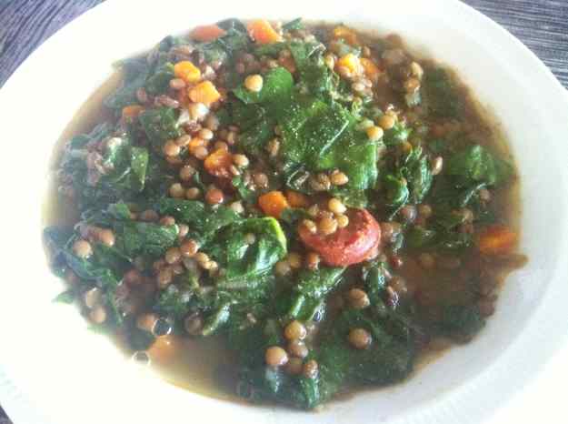 Remullar les llenties. Per cert que he invertit les quantitats d´espinacs i llenties de la recepta original. La veritat és que fa temps que la vaig posar en pràctica (però la penso tornar a fer en breu) i no recordo com va anar, però 400 grams de llenties em semblen moltes, i 250 gr d´espinacs (sobretot pesats en cru) molt pocs. De totes maneres, òbviament, podeu jugar amb les quantitats com vulgueu. Com deia rentem les llenties i les posem en una olla amb aigua freda, llorer, all, una pastanaga i una ceba (pelades, eh). A la ceba li clavo un parell de claus (espècie). Una mica de sal i les porto a ebullició. Baixo el foc i a partir d´aquí dependrà del tipus de llentia, però un mínim de mitja hora i un màxim d´una, aprox. Mentrestant fem un sofregit d´all i ceba, hi afegim una cullerada generosa de pebre vermell (picant o no, com vulgueu) i quan les llenties estiguin les colem i barregem amb aquest sofregit. Tot seguit hi posem els espinacs, dues o tres cullerades d´un bon vinagre, tapem i deixem coure uns cinc minuts. També hi podem posar la pastanaga de la cocció, així com altres coses que hi haguem posat a darrera hora pel nostre compte, com una mica de xoricet. Llestos.
