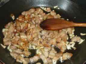 - Peleu el pèsols i poseu-los en una cassola, afegiu un raig d’oli, els alls tendres pelats i tallats a rodelles, el pernil a trossets, la sal i un rajolí d’aigua.