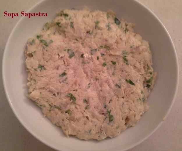 En una cassola, poseu el bacallà amb aigua freda que el cobreixi, el llorer, l’all, i les tiges del julivert. Poseu-lo a bullir durant uns 5 minuts. Atureu el foc, escumeu la superfície, traieu-ne les aromes i mantingueu el bacallà dins l’aigua uns 20 minuts. Ara l’escorreu i l’esqueixeu ben bé, traient-ne tota espina. Poseu aquest esqueixat en el bol d’un robot de cuina amb l’estri que hi hagi per batre no pas amb cap hèlix que talli. A una velocitat baixa, aneu-hi incorporant la barreja d’olis a poc a poc, com si fos un allioli. També la sal, el pebre i les fulles de julivert picades. Munteu-ho fins que tingui una consistència cremosa, en aquest punt s’hi poden incorporar anxoves picades (anul·leu la sal anterior) i/o tàperes). Poseu-hi tant d’oli com calgui depenent del pes de bacallà que hi hagi.