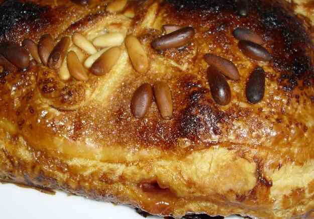 - Posar sobre la meitat dels rectangles una capa de formatge i aal damunt unes cullerades de melmelada. Pintar les vores amb una mica d’ou batut i tapar amb els rectangles buits, apretant bé els cantos per tal que no s’escapi el farcit. Pintar amb ou batut i posar-hi alguns pinyons i una mica de sucre al damunt.