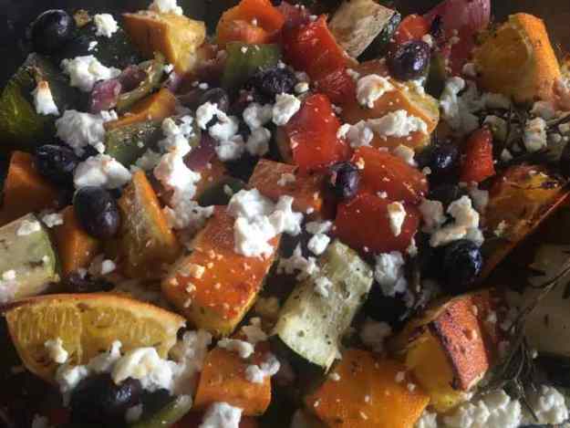 Es tan fàcil com tallar les verdures i les taronges, barrejar-les amb oli d´oliva i el suc de taronja, salpebrar-les i enfornar-les uns 45 minuts amb els alls sencers i amb pell. Els pebrots a tires, les cebes a quarts, els carbassons i la carbassa a daus. Passat el temps de forn, a 200 graus, hi afegim el formatge esmicolat i les olives, l´orenga i seguim la cocció quinze minuts més.