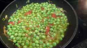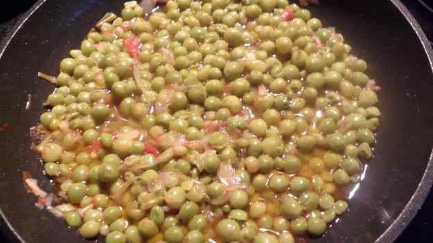 - Deixem coure una estona, afegim els pèsols i deixem coure fins que es begui l’aigua i veiem que el tomàquet està cuit.