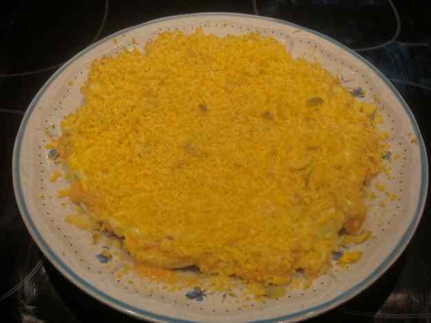 - Col·loquem els ous en un plat en forma de flor. Repartim per damunt dels mateixos la mescla anterior dins de les concavitats dels ous. Ara repartim pel damunt de tots els ous, fins que els cobrisca del tot, una bona capa de la maonesa casolana. Agafem els rovells que havíem reservat i els ratllem amb un rall per damunt de l’allioli. En estar, els posem a la nevera fins que estiguen fresquets.
