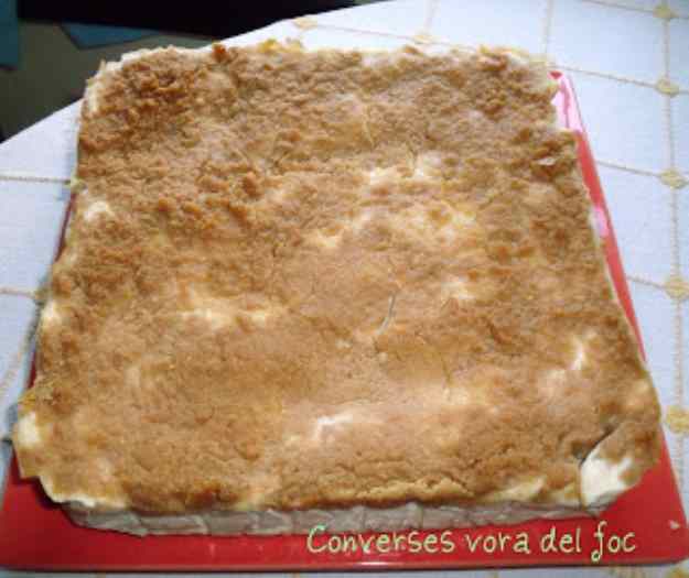 Dividir la crema en dues parts, el compost de formatge en tres porcions i les galetes mòltes restants en tres parts més. - Abocar una part del compost de formatge en el motlle, escampar les galetes mòltes per sobre i seguir alternant pisos de crema, galetes i formatge. Cobrir la superfície amb les últimes galetes mòltes i coure al forn, escalfat a 170ºC durant 1 hora. Deixar refredar el pastís i reservar a la nevera durant 5-6 hores. Finalment, desemmotllar i servir molt fred.
