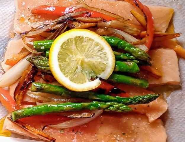 - Tallem el paper sulfuritzat en trossos grans posem a sobre del paper el llom de salmó, el salpebrem i tirem per sobre el suc de llimona.
