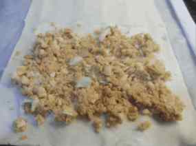 - Posem la meitat de una pasta de full en una plata de forn i afagim el farcit a la meitat de la pasta