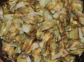 - Quan l’oli esta calent aboquem les carxofes i baixem el foc, salem i deixem fer uns 5 minuts amb la paella tapada.