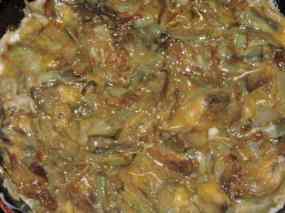 Afegim les cebes tendres, tapem la paella i deixem confitar a foc molt fluix, tot remenant-les de tant en tant. El fet de tapar la paella es important ja que les carxofes s’aniran confitant amb l’oli i el propi vapor que farà la paella. - En un bol debatem els ous, salem i afegim les carxofes escorregudes i barregem be.
