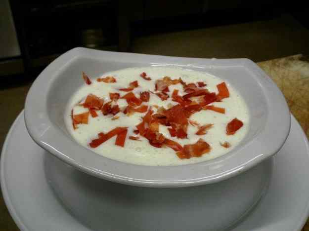 - Tallem el meló a trossos traient la pell i les llavors. El triturem amb el suc de llimona i el crema de llet. Hi posem un pols de pebre negre.