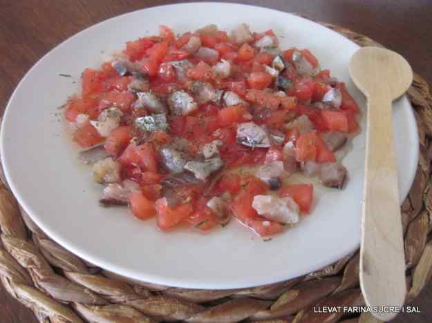 - Pelem el tomàquet, treiem les llavors i fem trossets de la mida de les sardines.