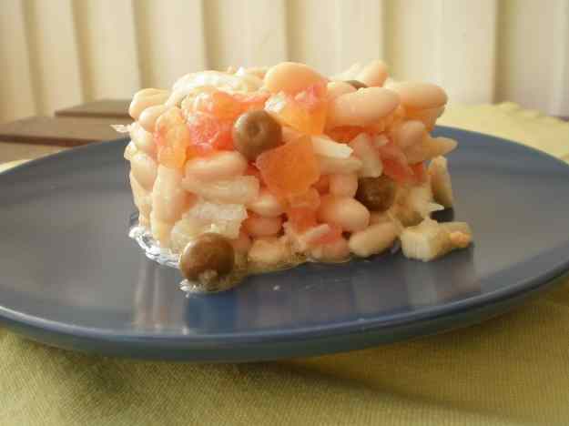 - En plats o cassoles individuals aneu-hi posant, alternadament, mongetes seques, bacallà esqueixat, el tomàquet tallat a trossets (jo l’he pelat i li he tret les llavors), la ceba a trossets, i els ous durs a quadrets; tot això ben regat amb la salsa vinagreta; pose-hi així mateix les olives.