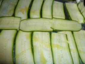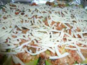 - A continuació comencem a muntar la lasanya: sucarem una safata de forn amb mantega, la cobrim amb les lamines de carbassó, a sobre repartim una mica del sofregit i sobre del sofregit repartim la mozarel.la. I repetim la mateixa operació dos vegades mes, acabem amb una capa de lamines de carbassó.