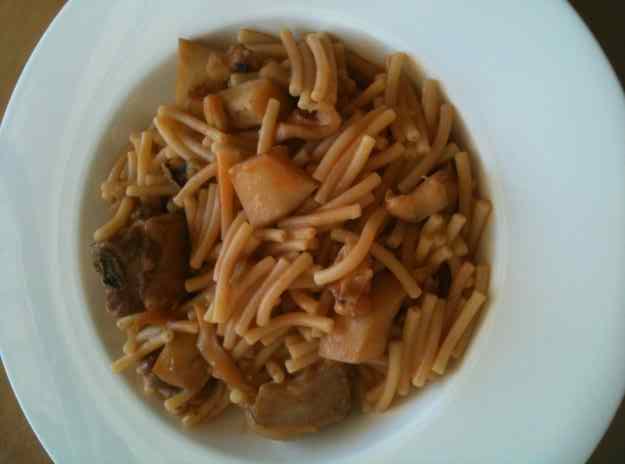 - Quan la sípia comença a canviar de color i a coure’s hi afegim ceba trinxada ben petita. Després anem afegint pebrot verd, pèsols i tomàquet rallat per fer el sofregit. Hi incorporem la costella i els fideus i remenem bé per barrejar-ho tot. Afegim el fumet de peix calent i portem a ebullició fins que els fideus quedin cuits al punt que desitgem. En l’últim moment salem una mica. Ja ho tenim a punt