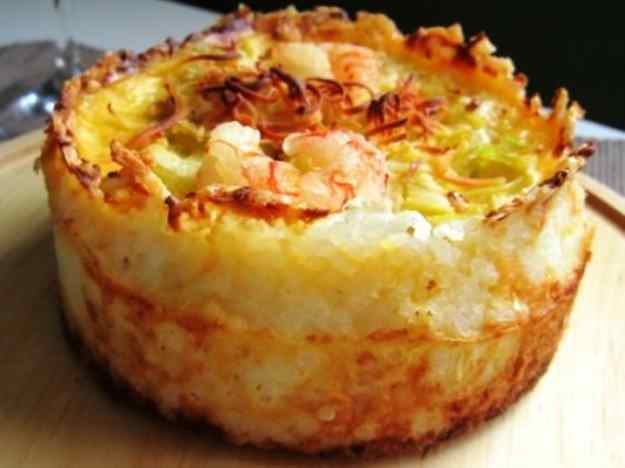 - Ara ja podeu muntar la quiche. Esteneu la ceba sofregida a la base d’arròs que teniem reservada. Escampeu seguidament el porro bullit i ompliu la base amb el preparat de nata i ous. Al damunt distribuiu les gambes (prèviament pelades). Enforneu a 200 graus durant 35-40 minuts. Punxeu amb uns escuradents per saber si està cuita i un cop ho estigui, desemmotlleu.