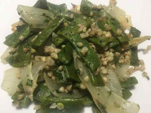 Tallem la ceba a juliana, la barregem amb una cullerada d´oli i un xic de sal i la posem en una safata al forn uns vint minuts. Mentrestant bullim el blat sarraí i fem al vapor la mongeta verda. Piquem la menta i l´estragó i ho barregem tot plegat. Servim si ho volem calent o ho deixem reposar una estona si ho utilitzem en plan amanida. I, si voleu, hi afegiu l´amanimenta de iogur.