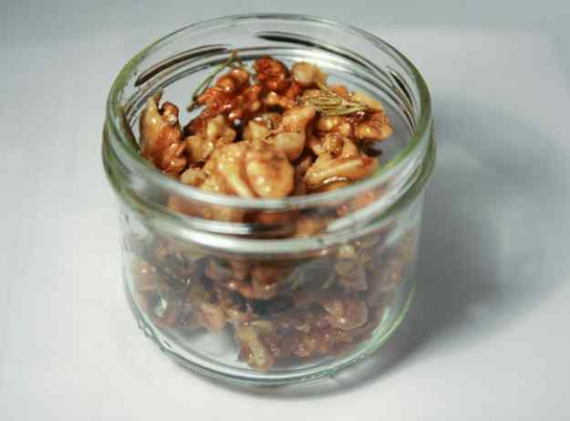 Desfem la mantega i en un bol la barregem bé amb les nous i tots els altres ingredients (romaní suficient, però sense passar-se). Això ho posem en una plata que pugui anar al forn, que tenim precalentat a 170 graus. Ho deixem una estoneta al forn (jo tenia la safata avall de tot del forn i ho he posat amb calor a dalt i a sota) fins que la mel ja bombollegi i les nous veiem que comencen a agafar un color torradet. Ho traiem, ho posem al recipient adequat i ja es poden consumir. Que segurament serà molt molt ràpidament.