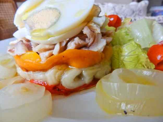 3. Poseu un cercol damunt del plat i a comenceu posant el pebrot vermell, saleu i olieu, desprès l’albergínia, també amb sal i oli i el pebrot groc, amb sal i oli.