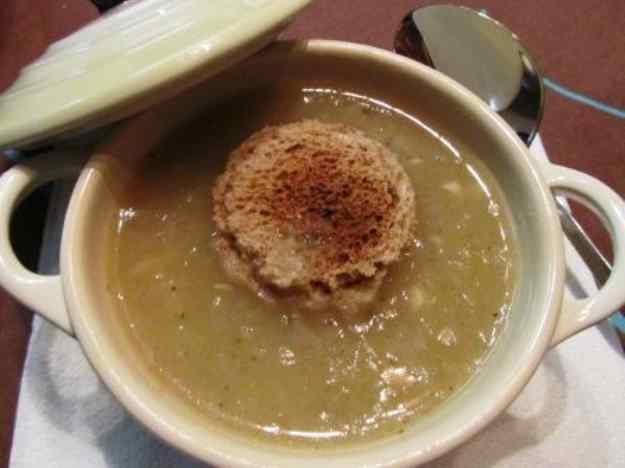 Peleu i talleu les cebes a juliana. Escalfeu en una cassola l’oli i desfeu-hi la mantega, afegiu la ceba i l’all picat, afegiu una mica de sal i pebre negre (al gust). Cuineu lentament la ceba (durant 25 minuts aproximadament). Remeneu de tant en tant amb una cullera de fusta. Cal que no agafi color. Un cop la ceba estigui tova afegiu la farina (com si féssiu una beixamel) cuineu-la durant uns segons i afegiu el xerès i deixeu que s’evapori. Aboqueu el brou de verdura i bulliu durant 15 minuts a foc suau. Serviu la sopa en recipients individuals que puguin anar al forn poseu una llesca de pa al damunt i escampeu-hi una mica de formatge (jo no en poso). Ara només cal que ho gratineu al forn durant 5 minuts