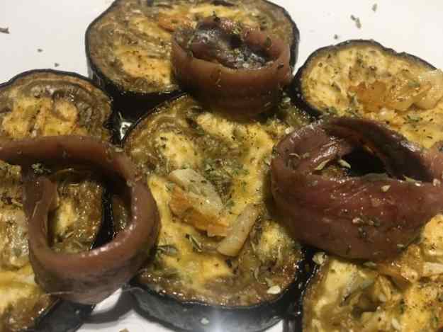 Poseu el forn a 200 graus, talleu les albergínies a rondanxes gruixudes i les pinteu amb un pinzell amb oli. Salpebreu i enforneu fins que estiguin ben cuites, mitja horeta ben bona. Mentrestant sofregiu els dents d´all laminats i quan les albergínies surtin del forn podeu els alls x sobre, julivert i orenga.
