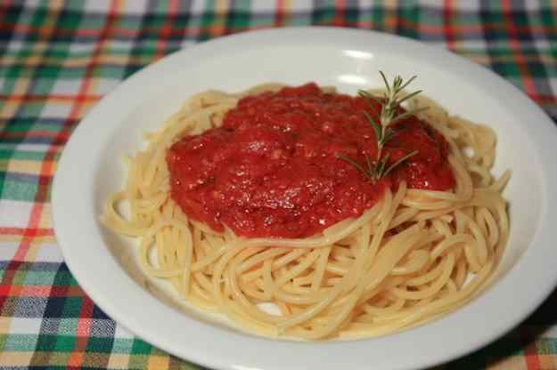 - Per altra banda, fem els spaghetti a la manera habitual: aigua bullint, li tirem un pessic de sal quan bulli i després la pasta, que la treurem quan estigui al dente (al paquet ja trobareu l’indicació del temps que demana cada pasta). Els traiem de l’olla, els escorrem, els posem al plat, amb un cullerot hi posem la salsa per sobre i una mica de parmesà ratllat al costat per servir a discreció.