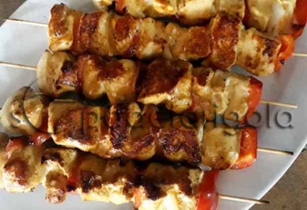- Tallem el pebrot i la ceba a trocets d’uns tres cm. i ja podem enfilar. anant intercalant pollastre, ceba i pebrot.