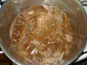 - Es cola el brou, amb un colador fi, i es posa a una olla que càpiga a la nevera.