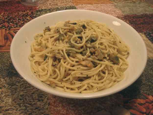 - Afegiu els spaghetti a la cassola i regueu-los amb un bon rajolí d’oli. Obriu les llaunes de les cloïsses i escorreu-ne el suc dins la cassola. Afegiu-hi les cloïsses i aneu remenant per tal que la pasta no s’enganxi.