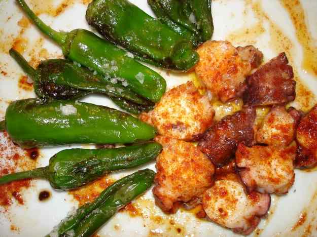 Es bull el pop uns 45 min. Es tallen les potes a rodelles, s’espolsen amb pebre vermell i sal Maldon i finalment se li tira un rajolí d’oli. Els pebrots es fan a la planxa amb 5 gotes d’oli i s’espolsen de sal Maldon.