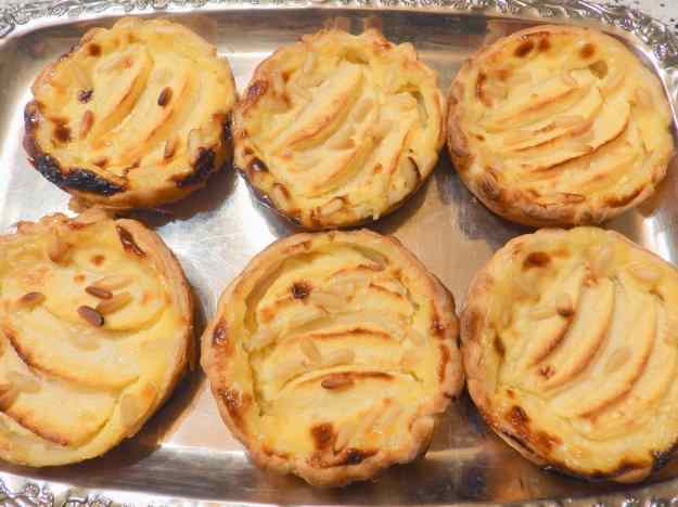 - Aboqueu la crema repartida entre els motlles, (damunt de la poma), no cal omplir-los massa. Escampeu uns quants pinyons pel damunt i enforneu de 15 a 20 minuts, fins que estiguin rossets.