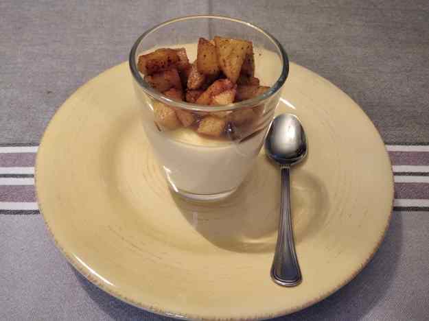- Un cop la panna cotta ha agafat la textura, posem una cullerada de melmelada de figues i a sobre les pomes cuites. Si ho heu fet amb motlles, les desemmotlleu i decoreu com més us agradi.