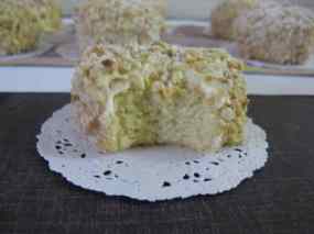 - Agafem els pastissets i amb una espatula o ganivet els untarem amb la crema de mantega I després els arrebossarem amb el granet d’ametlla, hi posem una mica de sucre fi per sobre i ja els tenim a punt.