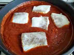 - Escalfem la salsa en una cassola, afegint-hi una mica de brou de peix si us ha quedat massa espessa. Hi poseu el bacallà i ho deixeu uns cinc minuts, a fi que s´escalfi el peix i s´impregni de la salsa.