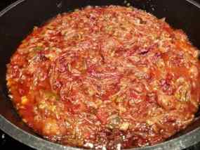 - Pasats els primers noranta minuts de cocció de la ceba hi afegim els tomàquets, pelats i sense llavors, el pebrot verd i el porro. Remenem bé, tapem i vinga, una horeta més.