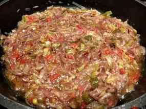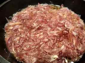 - Pelem i tallem la ceba a juliana i els alls per la meitat. Sofregim primer els alls, incorporem la ceba i deixem coure, a poc a poc, una hora i mitja.