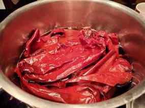 - Posem aigua a escalfar per escaldar els pebrots xoriceros. Antigament es posaven hores i hores a remullar, però anireu molt més ràpid si els escaldeu, partits per la meitat, amb les llavors retirades, i tot seguit els deixeu remullar una estoneta, però poc, vint minuts és més que suficient.