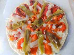 - Empolseu una part del formatge damunt de la pasta talleu els pebrots i cebes a talls allargats i poseu-los damunt del formatge talleu la cansalada a talls prims i allargats i poseu-los damunt, saleu, olieu i empolseu amb la resta de formatge.