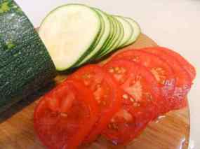 - Renteu i talleu les tomates i els carbassons a rodanxes primes, saleu i empolseu orenga i les poseu en una safata amb un raig d’oli introduïu al forn reescalfat a 180ªC., i coeu uns 15 o 20 minuts, fins que veieu que les hortalisses daurades podeu servir calent o tebi.