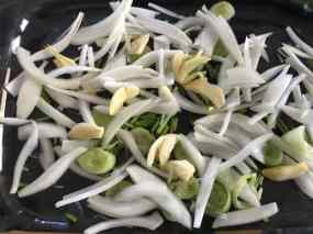 2. Ara teniu dues opcions. La primera és saltejar la ceba a la cassola on heu marcat el pollastre, i que seria la de fer la recepta a la cassola. La segona, que és a on correponen les fotos, seria posar en una safata de pyrex la ceba tallada a juliana juntament amb les tiges de cilantre, els alls i el gingebre tallat a juliana.