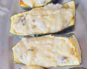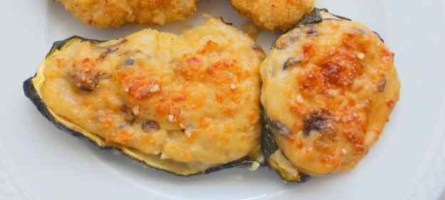 - Desfeu la fècula en la llet, barregeu-hi l’aigua d’hidratar els bolets i aboqueu-ho al sofregit, remeneu be fins que espesseixi com una beixamel amb aquest crema, ompliu les barquetes de carbassó empolseu amb el formatge rallat i enforneu a forn escalfat a escalfat a 190ºC., uns 10 minuts fins que quedi el formatge gratinat.