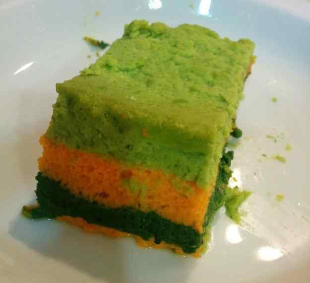 - Agafem el motllo rectangular, l’untem bé de mantega perquè no s’hi enganxi el pastís i distribuïm les capes, tot allisant amb una espàtula, intentant deixar-ho tota la capa del mateix gruix. L’ordre de baix a dalt: la meitat del pèsol a sota, la meitat de pastanaga, tots els espinacs, meitat pastanaga i meitat pèsol. Posem el motllo (tapat amb paper d’alumini) al forn precalentat a 200 graus. Al cap d’uns 40-45 minuts ja ho tindreu. Podeu fer la prova d’enfonsar-hi un escuradents per veure que ha quallat bé. Deixeu que el motllo que es refredi i després, amb molta cura, desmotlleu el pastís. Si no el mengeu al moment, quan l’aneu a servir el podeu escalfar una estona al forn, per servir-lo tebi.