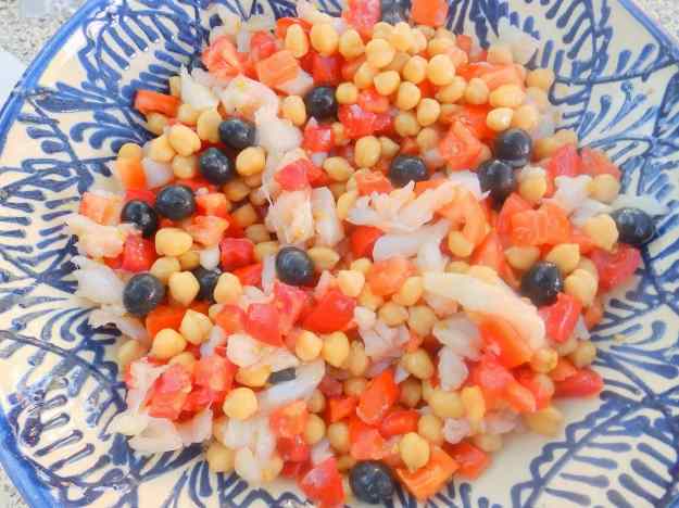 - En un bol gran, poseu els cigrons, el bacallà, les olives, el pebrot, la ceba i la tomata ben espremuda. Amaniu amb l’oli d’all.