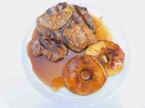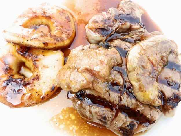 - Poseu els filets als plats, amb el fetge al damunt, la poma al costat i 2 cullerades de salsa de vi.
