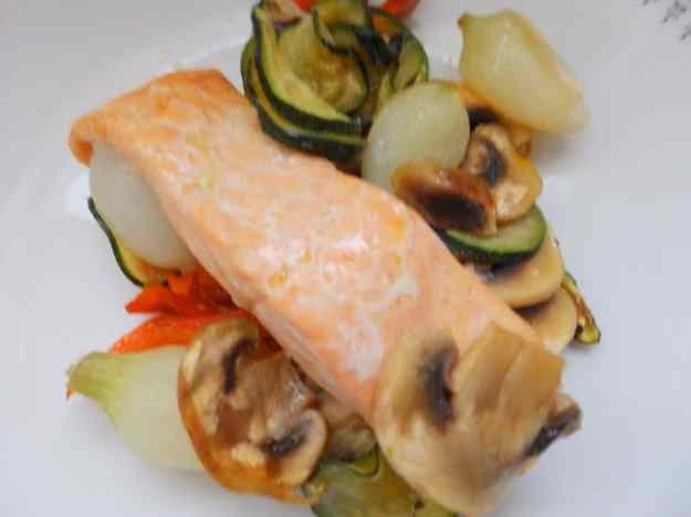 - Poseu tots els ingredients excepte el salmó en el cistell per coure al vapor, saleu i poseu un raig d’oli pel damunt, coeu al vapor 15 minuts, destapeu i poseu el peix damunt amb un polsim de sal i oli, torneu a tapar i coeu 8 o 10 minuts més, depenen del gruix del peix.