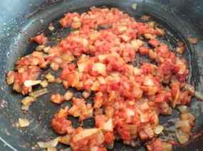 - Quan està rossa hi afegim el tomàquet, tallat a daus sense pell ni espines, i deixem que vagi fent.