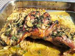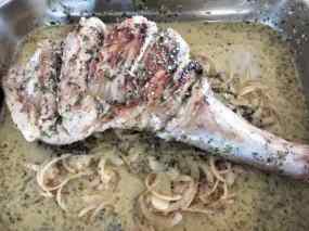 - Ho recuperem tot plegat, de fet fins i tot la safata on hem marinat el xai, ja que ens anirà millor per coure´l al forn. Afegim una mica d´aigua a la marinada que hem reservat per poder tenir més líquid i així anar ruixant l´espatlla al llarg de la cocció. El posem a 200 graus una hora i mitja.