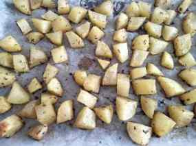 - Mentrestant preparem les patates, que també les courem al forn però en una safata diferent. Les tallem a l´estil de les braves, les untem amb oli, sal, pebre i orenga i les enfornem entre 35 i 40 minuts