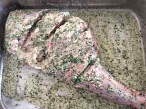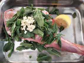 - Quan compreu l´espatlla demaneu a la carnisseria que us facin tres marques. Tritureu els elements de la marinada (fulles de menta, deixant-ne unes quantes per al final; all, oli, vi ranci) i els escampeu bé per tota la carn, psant-ne dins dels talls, que s´impregni bé. Ho filmeu i ho reserveu dues hores a la nevera i una tercera a temperatura ambient.