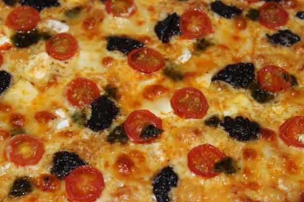 - Per sobre el formatge ratllat poseu-hi els tomàquets cherry partits per la meitat, el formatge de cabra a trossets, el paté d’olivada ben escampadet i l’alfàbrega picada. En aquest cas, com que no tenia alfàbrega fresca n’hi vaig posar de la que ve envasada en tubets de plàstic, però fresca és molt millor. Si no teniu olivada, podeu posar-hi olives negres senceres.