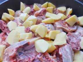 - Renteu i peleu les patates i feu-les a trossos grans, afegiu-les a la cassola.